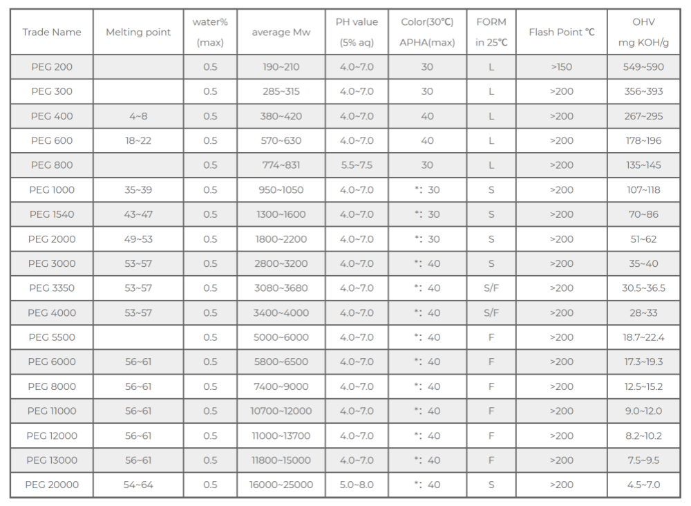 PEG-6000 a vyššie: Vysoká molekulová hmotnosť, tvrdá tuhá látka. Má vyššiu tvrdosť a teplotu topenia a bežne sa používa ako pomôcka na spracovanie kovov, lubrikant tabliet alebo glejivo na textil, ktoré poskytujú vynikajúce mazacie a disperzné účinky.